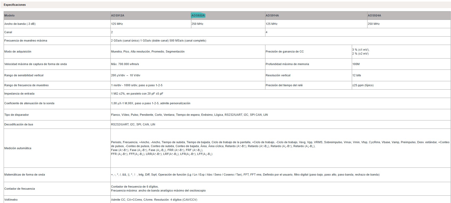 * Frecuencia máxima de muestreo: 2GSa/s (canal único) 1GSa/s (canal doble) 500MSa/s (canal completo)